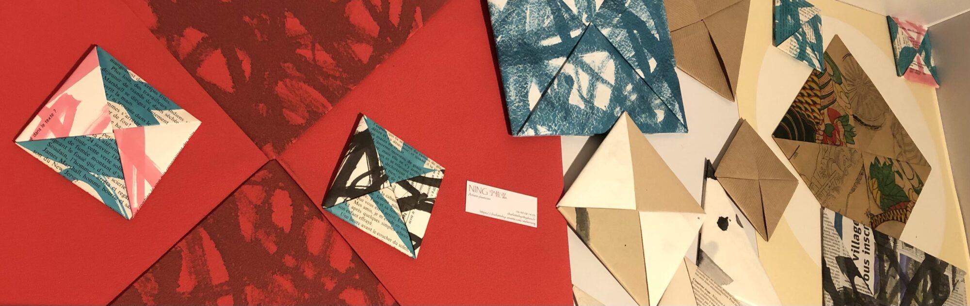 Les œuvres de Ning en papier plié, tels des « ban » surdimensionnés, portent la trace de mantras bouddhiques, ceux-là mêmes rapportés d’Inde par Xuan Zang. En convoquant ses souvenirs d’enfance, Ning révèle la trace d’histoires et pratiques culturelles, constructrices d’identité. Un retour en arrière vers la Chine de son enfance qui le lie à l’ici et maintenant. Entre ancrage, dépaysement et repositionnement. Une identité en mouvement. Une identité comme mouvement.