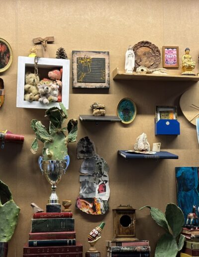 The installation presents itself as a cabinet of modern curiosities, a space where objects from various cultures and contexts are juxtaposed. By playing on oppositions, this work invites us to reflect on the duality between the natural and the artificial. The elements exposed, ranging from curiosities of the natural world to manufactured artifacts, create a fascinating dialogue between what is perceived as « natural » and what is considered « artificial ». This juxtaposition is not only limited to matter, but also extends to the geographic origins of objects, skillfully mixing Western and East pieces. Thus, the installation becomes a real mirror of cultural exchanges, where each object tells a unique story while participating in a collective narrative.